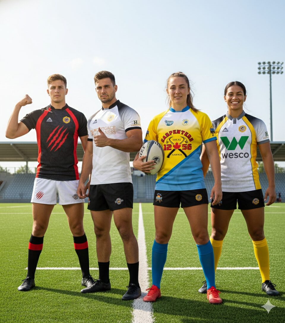Rugby: High-tensile jerseys with stretch rip-stop technology and reinforced overlock stitching.